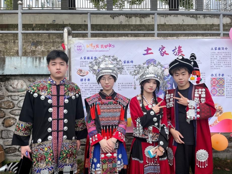 我院以土家族为主题积极参与民族文化节游园活动,通过展示土家族的灿烂文化,让更多的同学关注土家族的风土人情。活动中,学生身着土家族服饰,对土家族概况、文化、饮食、服饰等方面进行讲解,吸引众多同学前来参与活动。土家族的服饰,独具匠心,美轮美奂;土家族的文字,传承千年,意义非凡;土家族的歌声,悠扬饱满,震撼人心。活动现场,同学们积极参与趣味小游戏,猜测土家话、高角帽踢竹铃球、布见等,同学们在游戏中体验到土家族文化的独特魅力,活动现场气氛热烈浓厚。