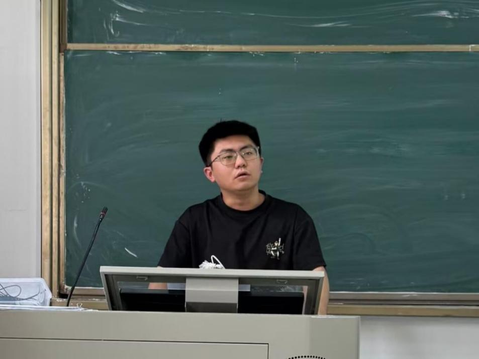 在3403教室,胡浩南同学以“心怀信念,脚踏实地”为主题,结合自身学习与成长经历,强调坚定理想信念、合理规划学业的重要性。他鼓励新生以积极心态面对挑战,不断提升综合素质,主动投身党团组织和竞赛活动,在实践中磨砺能力。