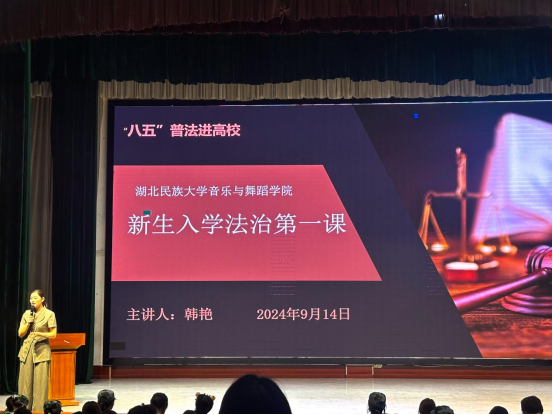 为深入学习贯彻党的二十届三中全会精神,进一步增强新生的法治观念与法治意识,促进平安校园、法治校园建设,9月14日,音乐舞蹈学院组织开展了2024级新生入学安全法教育讲座活动。讲座由恩施州律师协会副秘书长、湖北省“七五”普法“先进个人”、湖北省律师行业“优秀共产党员”韩燕律师主讲。