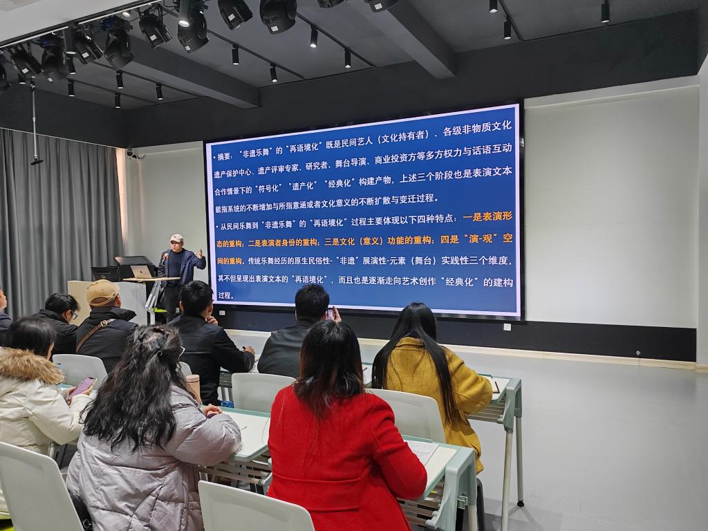 2024年11月29日上午,中国艺术人类学学会副会长、中国音乐学院中国音乐研究基地研究员、湖南省“芙蓉学者”特聘教授、湖南师范大学“潇湘学者”特聘教授赵书峰教授受邀到我院讲学,讲座主题为《“遗产华”▪“经典化”:传统乐舞类“非遗”项目的“再语境化”建构》。我院50余名师生参加了此次活动,活动由院长谷秋阳主持。