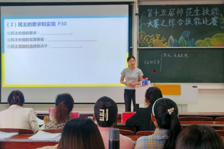 模拟授课过程中,11号选手黄琳淋以娃哈哈创始人宗庆后的个人事迹为切入点,展开《公民的基本权利》的讲述。她用宗庆后创业维护自身权利的故事,引出公民的政治权利、人身自由权力和社会经济与文化教育权利等知识。即兴演讲环节,65号选手闫俊围绕《我最喜欢的动物》展开演讲,演讲内容层层推进,富有节奏感。