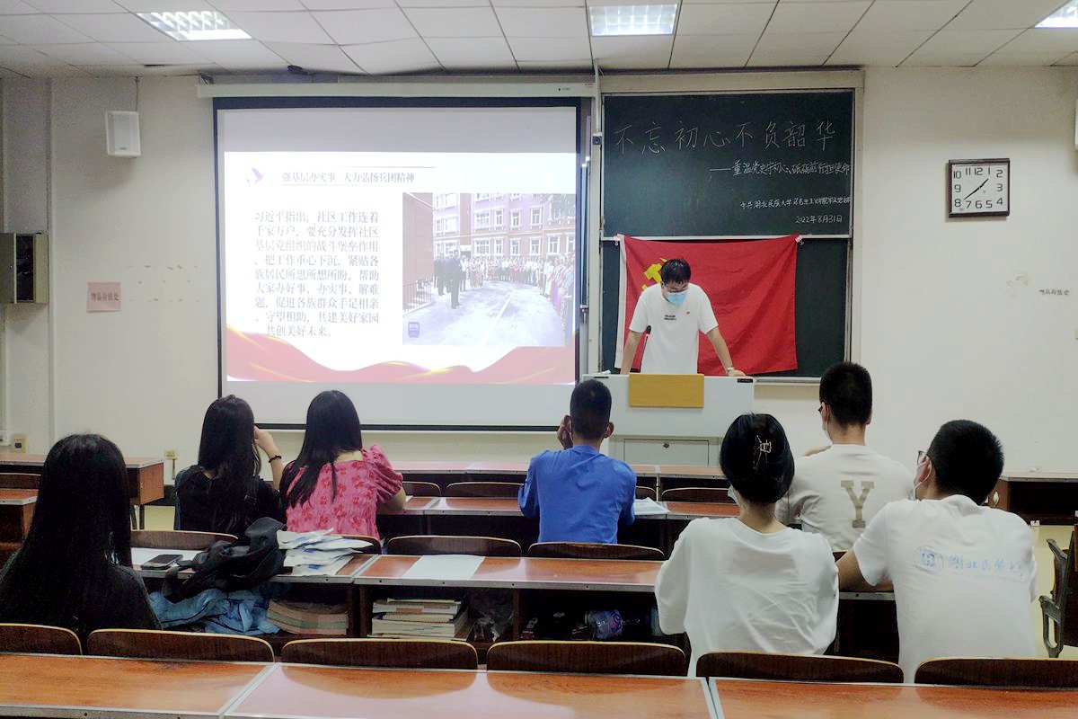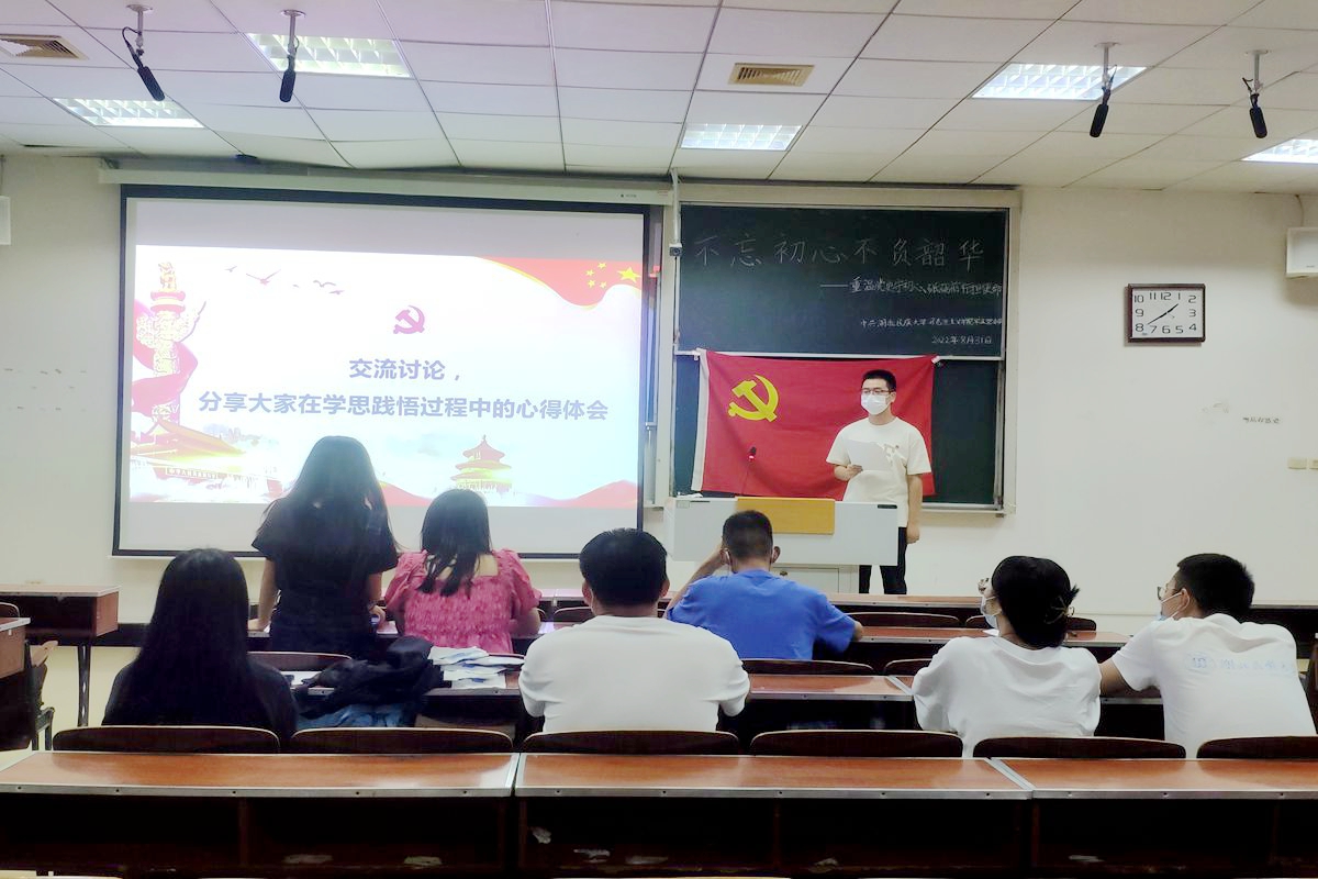 本网讯(通讯员 胡晓丽/文/图)8月31日,我院学生党支部于德智楼9B210教室开展八月主题党日。学生党支部书记杨婷,教师党员毛召、兰洁以及全体学生党员、预备党员参加。