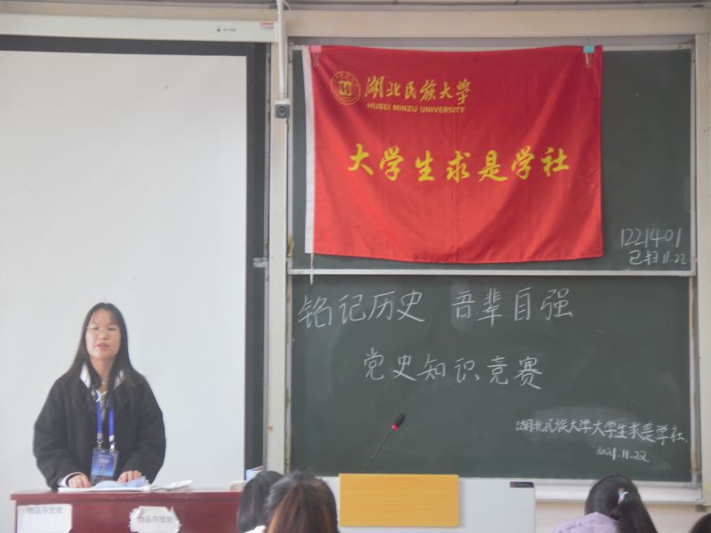 本网讯(通讯员 王婵媛 见习通讯员 成楠/文 向爱萍 孙航/图)为增强大学生对党史的进一步了解、拓展大学生视野和丰富大学生生活,11月22日上午,我院大学生求是学社在德智楼9B210教室成功举办以“铭记历史 吾辈自强”为主题的党史知识竞赛决赛。