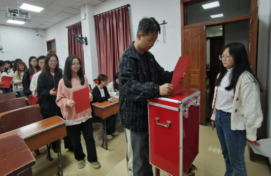 杨婷介绍6名团员代表候选人基本情况。团总支副书记钱松洋宣读《共青团jinnian金年会第一次代表大会代表选举办法(草案)》,并获得在场代表全票通过。大会推选并全票通过陈明玉为监票人,田瑜、谭田娜为计票人。46名团代表在监票人员的监督下进行投票并现场公开清点票数。大会选举产生了吴垚等4位共青团jinnian金年会第一次团的代表会议马克思主义学院代表。
