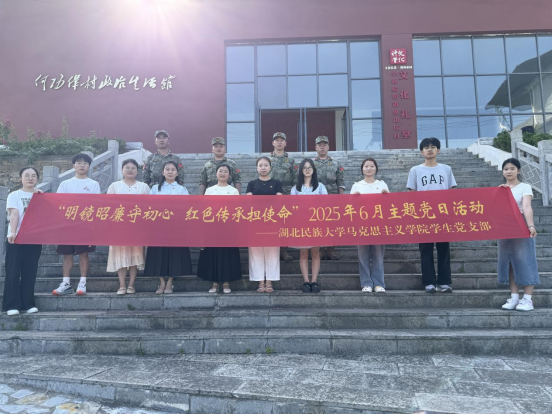 为深入贯彻中央八项规定精神学习教育,强化青年学生的党性修养与社会责任感,6月16日,马克思主义学院学生党支部前往恩施市小渡船街道与何功伟村党支部联合开展“明镜昭廉守初心 红色传承担使命”主题党日活动。马克思主义学院党总支副书记欧玲出席并讲授党课,学生党支部书记杨婷带领支部全体党员参加活动。活动由何功伟村党支部书记方尔雨主持。