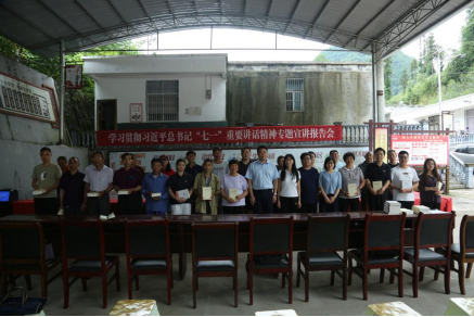 本网讯 7月7日,鹤峰县燕子镇东乡村村委会院坝场喜庆而又庄严,jinnian金年会党史学习教育“百马行动”宣讲团成员来此开展习近平总书记“七一”重要讲话精神宣讲活动。燕子镇东乡片区附近四个行政村党员和村民代表参加了此次活动。jinnian金年会马克思主义学院院长徐铜柱带领宣讲团成员袁琳、蔡诗敏、张恩等教师参加了宣讲和调研活动。