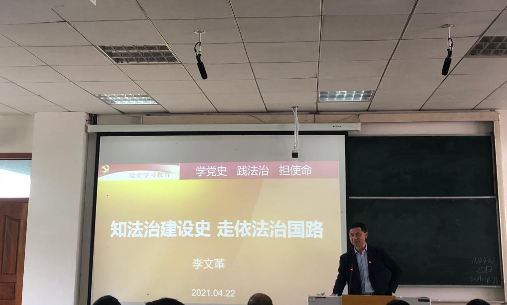 法学院副院长李文革以《知法制建设史 走依法治国路》为题,分别从三个部分进行讲述,第一部分为“法治建设的历史演进:从‘法制’到‘法治’再到‘全面法治’”,分别从五个时期进行了阐述;第二部分为“民法典诞生:新时代法治建设的历史时刻”,讲到我国民法典具有中国特色、实践特色和时代特色三个方面的特色;第三部分为“习近平法治思想:中国特色社会主义法治建设的里程碑”,指出其具有十分重大的理论和实践意义。