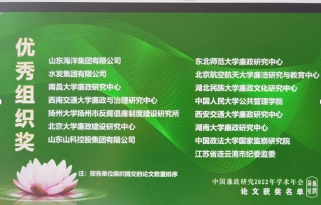 jinnian金年会马克思主义学院廉政文化研究中心作为本次会议会员单位,提交参会学术论文4篇,其中1篇获得大会“优秀论文奖”;同时,我中心获得大会“优秀组织奖”荣誉。会上,鲁帅做了题为《村党组织书记“一肩挑”背景下小微权力腐败的规避策略——基于国家财政农村投入资本化视角的分析》的专题发言,讨论通过创新国家财政农村公共投入管理体制和改革农村集体经济组织产权制度的方式,推动国家财政农村投入资本化规避小微权力腐败问题。