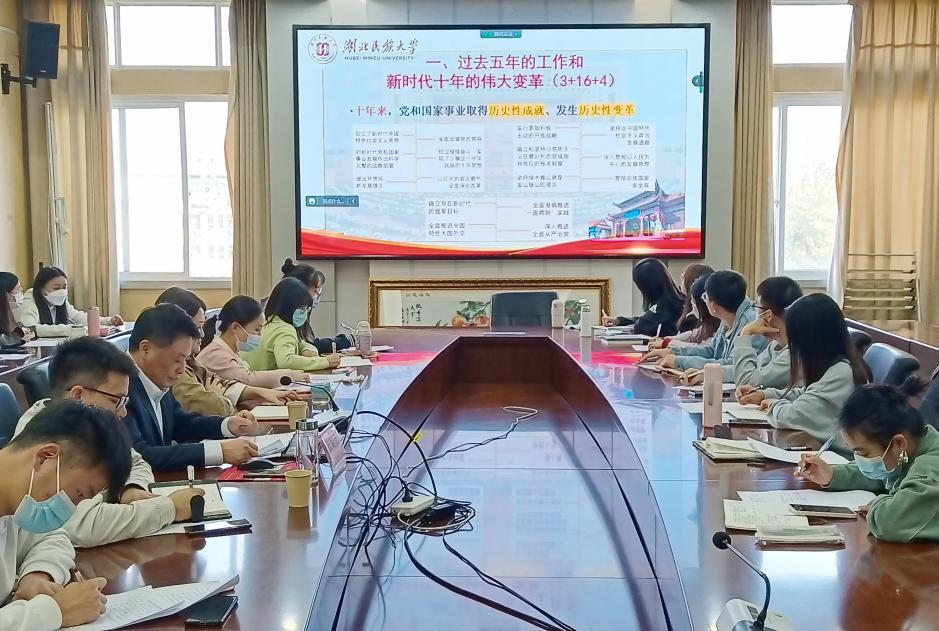 本网讯(通讯员 文/黄明辉 图/刘淼) 11月4日,我院举行马克思主义学院研究生学习宣传贯彻党的二十大精神辅导报告会。马克思主义学院院长徐铜柱教授作主旨辅导报告,马克思主义学院党总支副书记张明波,研究生辅导员罗欣和全体研究生通过线上线下方式参会。报告会由鲁帅博士主持。