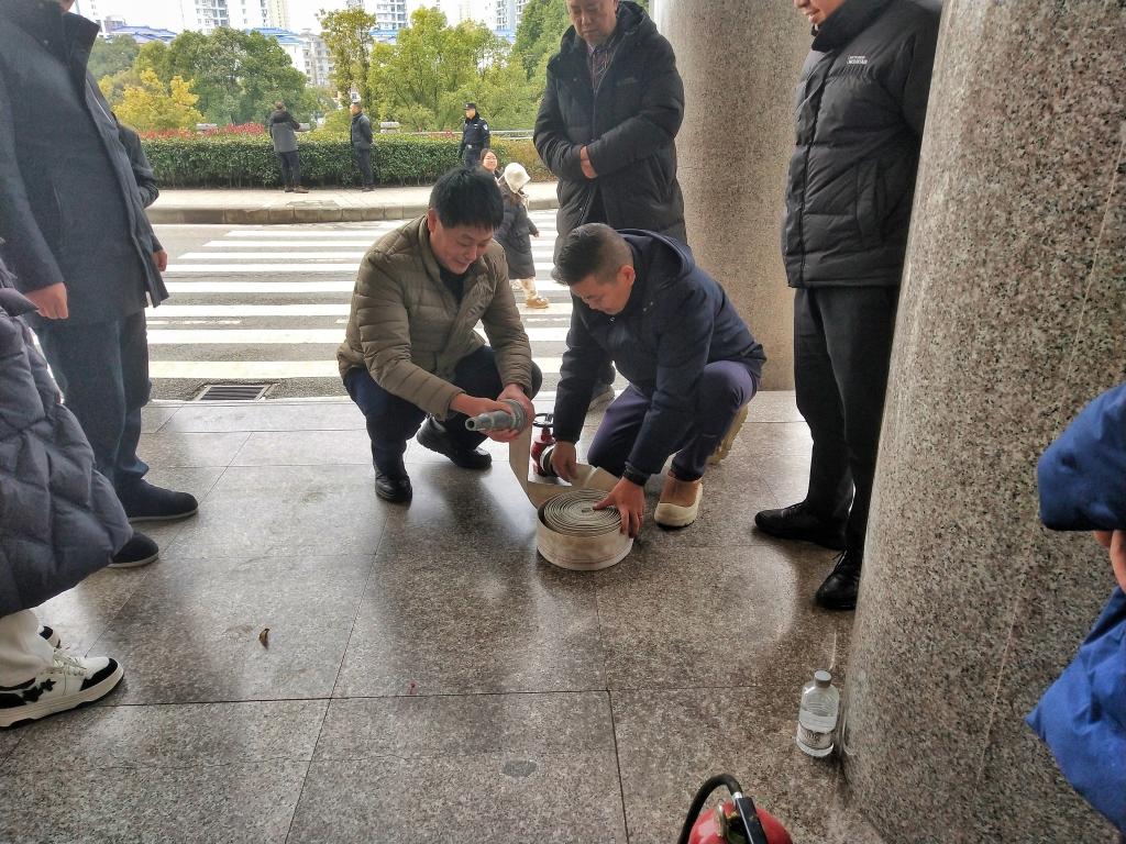 火灾演练结束后,消防科吕刚特别强调了火灾发生时的逃生技巧,并通过现场演示,向全体师生展示如何正确使用灭火器、消防水带,并强调相关注意事项和操作步骤。他提到,一是在发生火灾时,首先应判断火源位置及安全逃生通道,然后用湿毛巾或纸巾捂住口鼻,弯腰扶墙进行逃离。二是在使用灭火器时,首先应判断灭火器是否可用,如可用,用前需进行摇晃;然后“一提二拔三握”,在上风口将灭火器管口对准火源根部进行灭火。三是在取用消防水带前,需仔细检查水带,确保无裂缝、破损,并迅速捋顺水带防打结。使用时,一端紧密连接消防栓出水口并拧紧,另一端与水枪精准卡牢。开启阀门后,一人持枪依据火势控水流,另一人辅助让水顺畅灭火。结束后,迅速关水源,从水枪端慢收卷,检查无误后妥善存放。现场师生纷纷上前尝试,学习使用灭火器和安装消防水带。