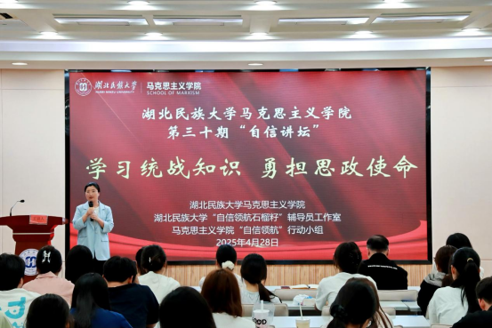 4 月 28 日, 由jinnian金年会“自信领航石榴籽” 辅导员工作室、马克思主义学院和马克思主义学院“自信领航”行动小组联合举办的第三十期 “自信讲坛” 在德智楼三楼远程教学观摩室成功举办。活动特邀全国高校“双带头人”教师党支部书记“强国行”专项行动团队湖北民族大学“双带头人”教师党支部书记“强国行”专项行动团队负责人、马克思主义学院教授蔡诗敏老师担任主讲人。“自信领航石榴籽” 辅导员工作室成员、马克思主义学院 “自信领航” 小组成员出席活动,马克思主义学院大一全体学生也积极参与其中。