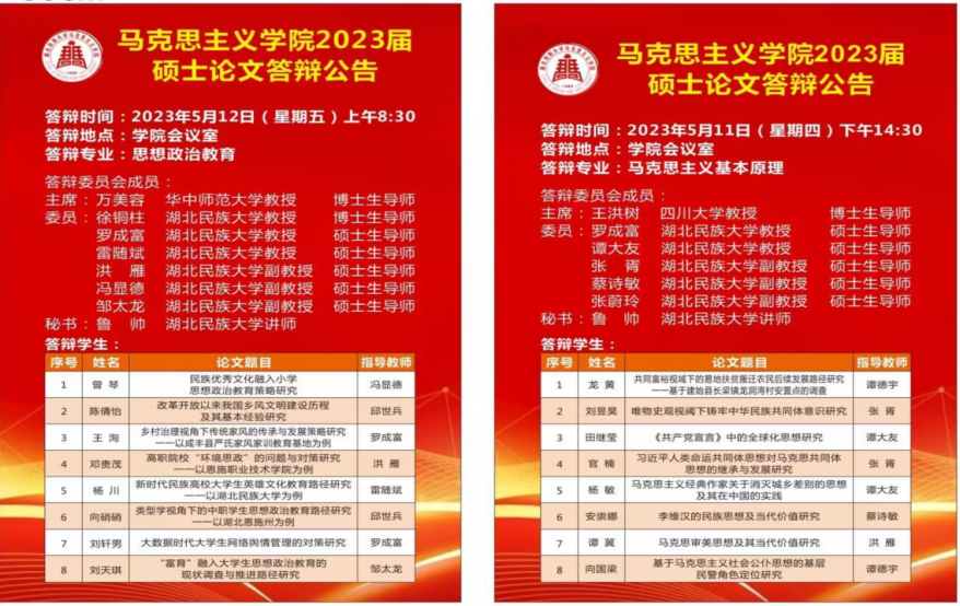马克思主义学院2023年硕士毕业论文答辩公告一