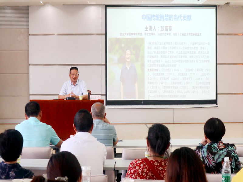 本网讯(通讯员 查婷 王婵媛 罗紫彤/吴丁鑫 董轩琳/图)6月24日下午,武汉大学哲学学院教授、博士生导师、珞珈杰出学者、十三届武汉市政协副主席彭富春莅临我院,在德智楼三楼多功能报告厅开展以“中国传统智慧的当代贡献”为主题的学术讲座。金年会党委副书记、副校长汪兴平,我院党总支书记罗成富,部分教师出席本次讲座,我院大二、大三全体学生参加此次活动。