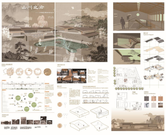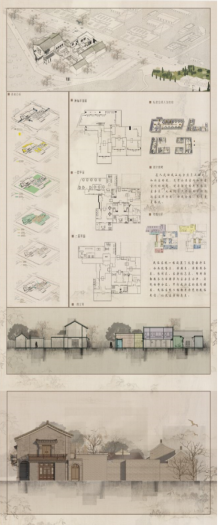 作品以装饰画为表现形式,安徽古村落作为主要设计元素,将村落的主要特色进行分析总结,提炼出建筑形态,雕刻装饰,村落水系三个点作为设计元素。参考中国传统山水墨画的颜色和意境传达方式,进行创新材料创新形式的表达。