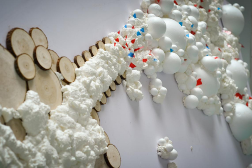 溢也可作过分的、超出的含义,如今随着生活质量的提高也随之输入了许多的“快餐文化",整体画面中使用圆木片拼贴的酒瓶与泡沫状固体,从密集到稀疏则表达了若是贪图一时灯红酒绿的快乐,都会像泡沫般消逝,最后内心只会留下空虚感。暗喻人们不要贪图一时之快,例如"快餐文化”的享乐,而忽略了身边的人与事,不要视而不见,忘记了健康而有益的事物与生活方式。