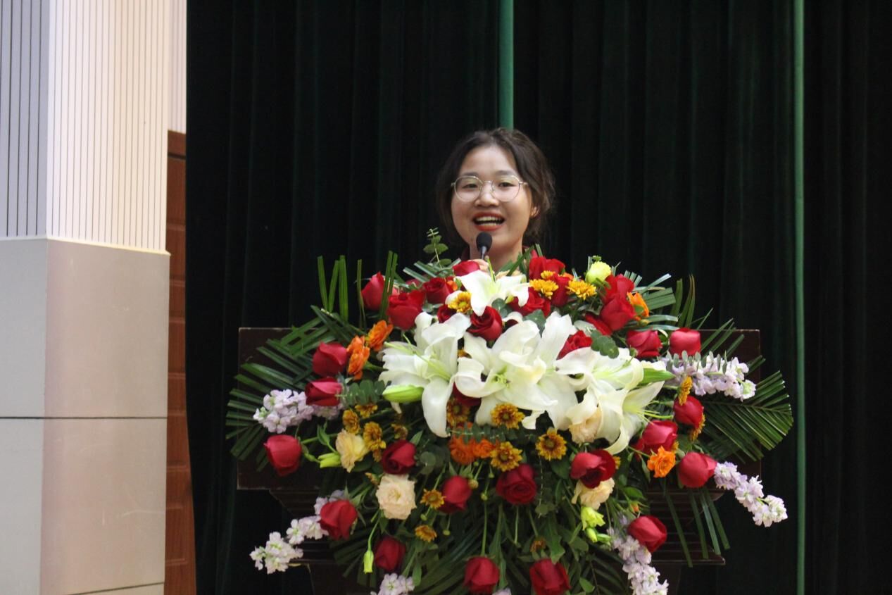 教师代表英语专业负责人舒婧娟老师结合自身教学经历为新生送上开学寄语。她鼓励新生同学要学会和环境互动,学会和历史对话,学会和他人相处,在今后的学习生活中找准人生的坐标和定位,勇敢应对未来世界的未知,成为缓慢而幸福的人。