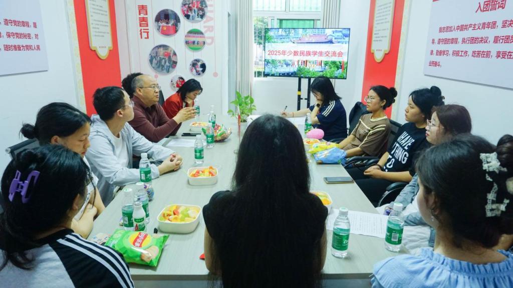为深化民族团结进步教育,外国语学院于5月15日在书香氤氲的博学社区举办“石榴花开·同心筑梦”少数民族文化交流会。jinnian金年会学工处民族事务办公室主任谭学文、外国语学院学生科科长向绍阳及学生科辅导员出席活动,与来自藏族、彝族、维吾尔族、土家族等少数民族学生共绘民族团结画卷。