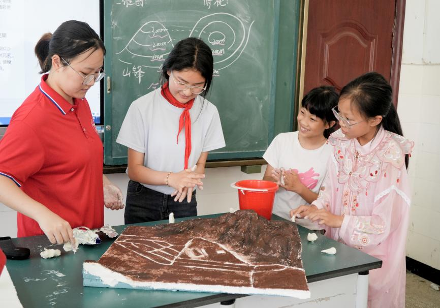 团队成员易思如与学生共同搭建南坪乡地貌沙盘