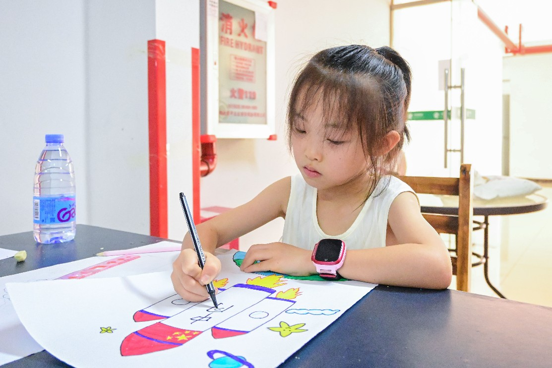 在“中国航天”主题创作环节。队员们通过生动有趣的讲解,让孩子们了解了中国航天的辉煌成就。孩子们热情高涨,纷纷用画笔描绘出航天火箭直冲云霄、嫦娥探测器登陆月球等壮观场景,表达对祖国航天事业取得巨大成就的自豪之情。