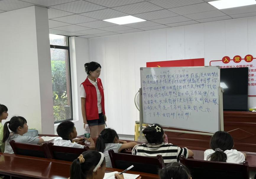 活动的核心环节是围绕经典篇目《中国少年说》展开的诵读训练。志愿者们充分发挥专业特长,为孩子们设计了科学、系统的教学流程。孩子们在志愿者设定的节奏中击掌诵读,洪亮的声音饱含深情,彰显出新时代少年的蓬勃朝气与自信风采。