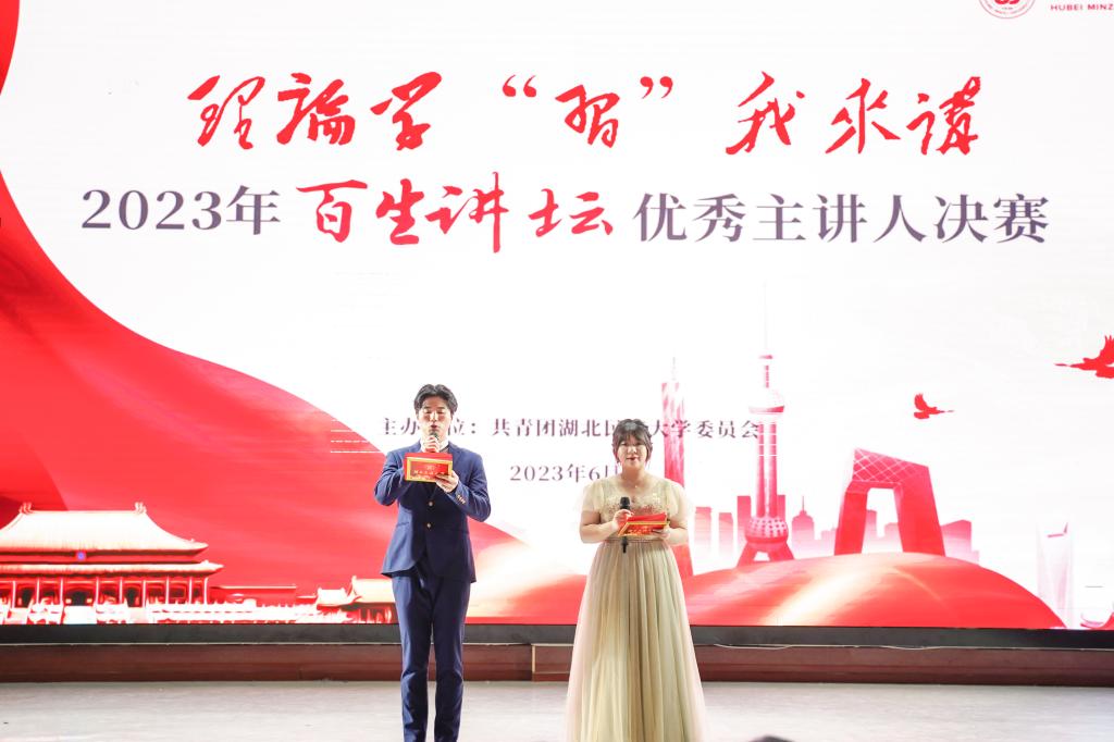 6月5日晚,金年会2023年“百生讲坛”校级优秀主讲人决赛在音乐舞蹈学院演播厅顺利举行。金年会党委统战部副部长陈妍,党办、校办副主任尼继珍,学生工作处副处长李建华,校团委副书记彭弥,党委宣传部理论教育科科长谭婷婷受邀出席并担任评委。