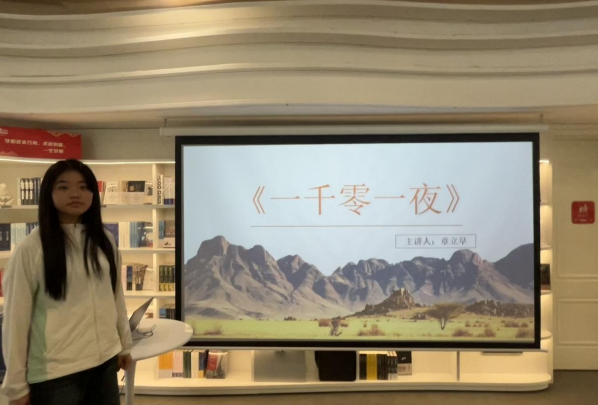 章立早带领同学们畅游《一千零一夜》。她表示:“我深刻体会到经典书籍跨越时空的魅力。书中奇幻故事如璀璨星河,从神灯精灵到辛巴达航海,每个故事都饱含智慧与温情。分享过程中,大家一同沉浸于异域文化,热烈讨论角色与情节,不仅传递了阅读乐趣,更让我明白好书分享是思想与情感的双向奔赴。”