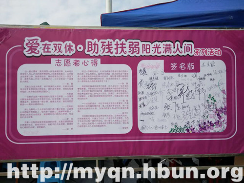 “无数次为虽为残疾却不颓废的人感动,无数次为能伸出手去帮助他们而快乐。他们是不幸的,但他们却是幸福的,因为他们那颗坚强的心。—冉源媛”现场展板志愿者心得如是写到。(编辑 李彦丽 责任编辑 章长慧 审核 赵丕峰)