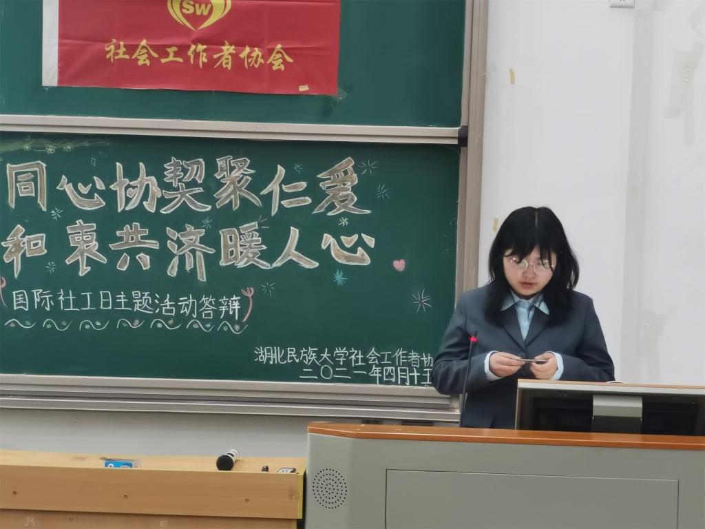 本网讯(记者 张筱玉/文 武依帆/图)为提高学生对公益活动的参与性,弘扬社会工作精神,4月15日,jinnian金年会社会工作者协会在修远楼5B404教室开展以“同心协契聚仁爱,和衷共济暖人心”为主题的国际社工日策划答辩会。社团指导老师张雯、学生科实习老师顿山,民族学与社会学学院团总支副书记肖洪、余雪梅,民族学与社会学学院学生主席郑凤娇、副主席方澳历受邀担任本次答辩会评委,jinnian金年会部分学生参与聆听。