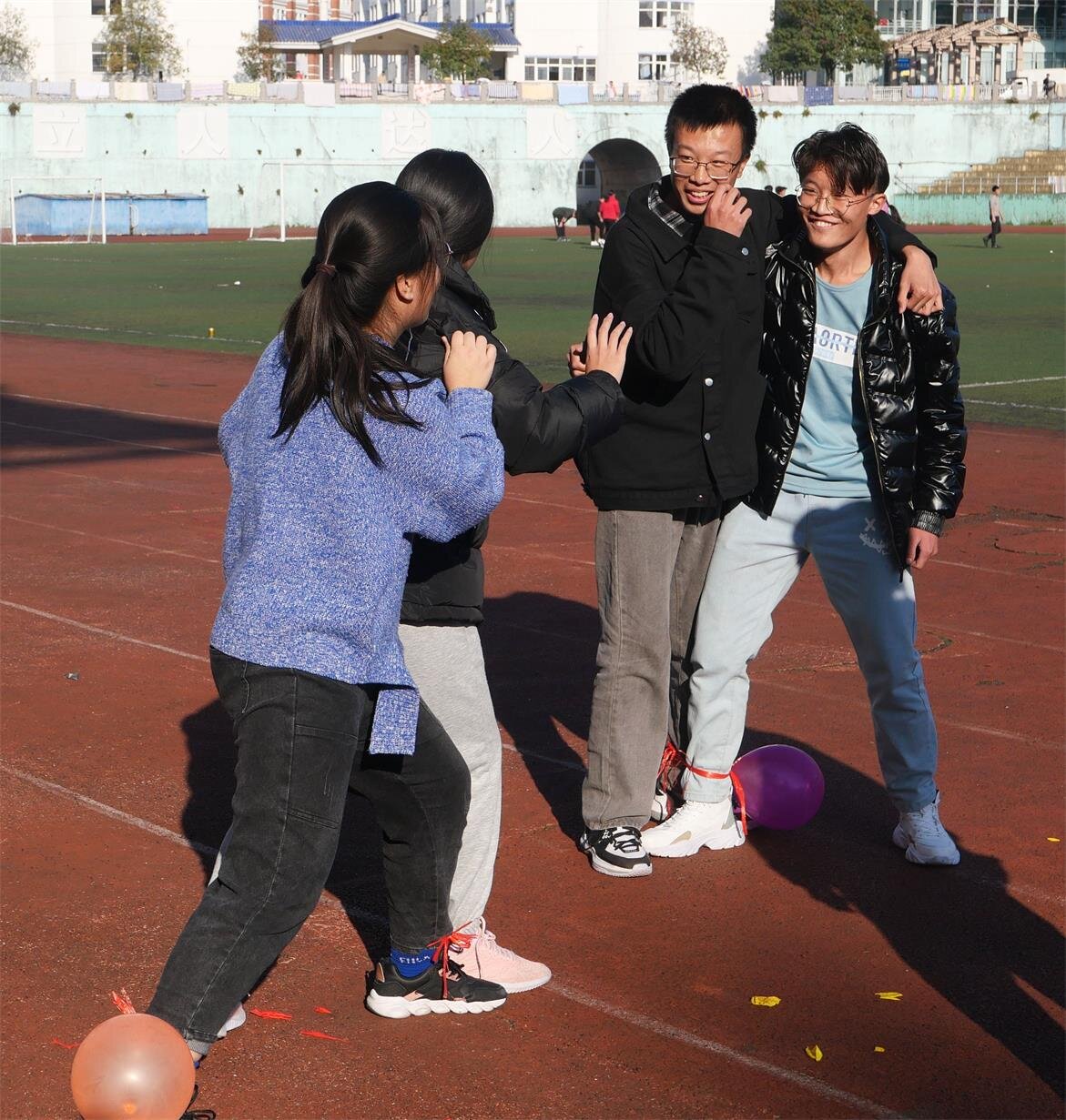 本次活动分为“健身操”“踩气球”“两人三足”“九宫格”和“盲人摸巷”五个环节。活动伊始,心理健康部部长吴六金带领全体学员进行热身运动。在“踩气球”环节,四队成员两两分组,以“两人三足”的形式进攻或保卫气球。“九宫格”环节中,全体学员以最快的速度将棋子连线,该游戏考验成员反应能力和团队意识。最后的“盲人摸巷”环节,工作人员从旁提示,参与者全程闭眼,在带领人的引导下齐心踏步,并肩同行,顺利通过预设的障碍路线,将活动气氛推向高潮,该游戏环节旨在指引学生干部要相互信任,树立团队意识,从集体中发掘自我潜力。