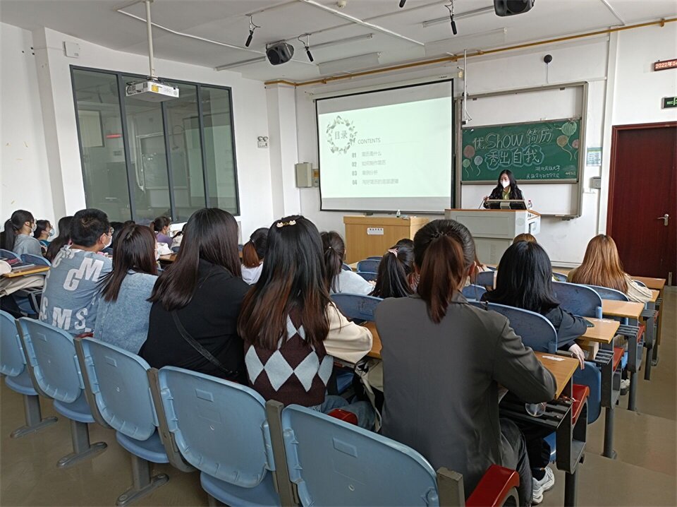 本网讯(记者 谌海容 陈慧超/文 陈舒琦 董金科/图)为引导我院学生制作优秀简历,增加就业竞争优势,4月8日,我院学生会宣传与语言文字工作部于修远楼5A501教室开展以“优Show简历,秀出自我”为主题的简历制作讲座。我院彭晨老师担任活动主讲人,全体大三学生参加本次活动。