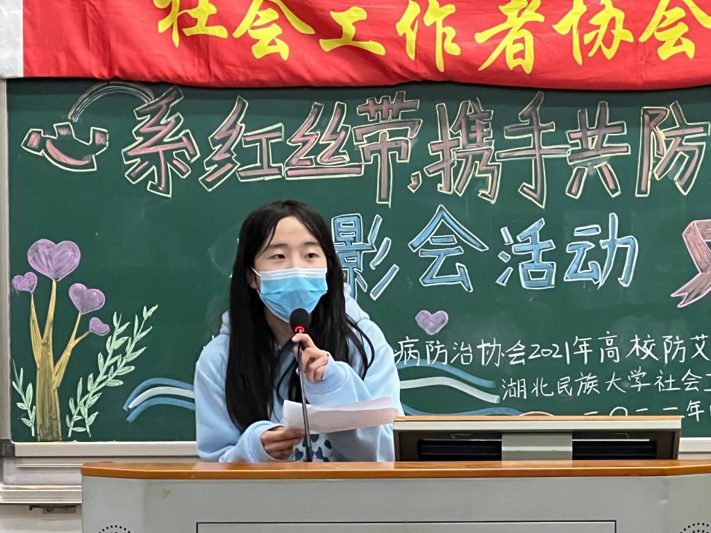 在观影会环节中,学生观看《我是大医生》防艾宣传影片,影片从艾滋病的危害、传播途径、症状、检测方法及预防措施五个方面宣传艾滋病相关知识。传播途径主要分为性传播、血液传播和母婴传播,其中食用伪装成食物的新型毒品极有可能产生不安全的性行为从而导致艾滋病。影片中强调学生应约束好自己,不要听信陌生人,建立良好的生活习惯。