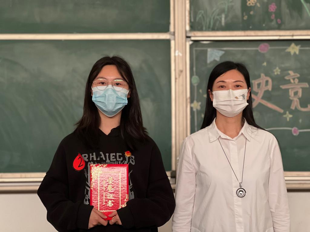最后,由杜鹏老师、廖正丽老师、冉红芳老师以及姚萍、刘圣富为参赛者颁发奖品为其祝贺。2号竞赛者谢婉莹以260分的高分荣获团史竞赛第一名。