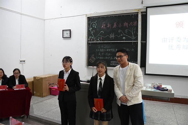 辩论结束后,优秀辩手李佩霖作为代表发言,他对双方辩手、指导老师、工作人员致以谢意并对辩论赛过程中出现的流程不当问题进行简单概括,希望在座学生能感受到辩论的乐趣及语言的魅力。