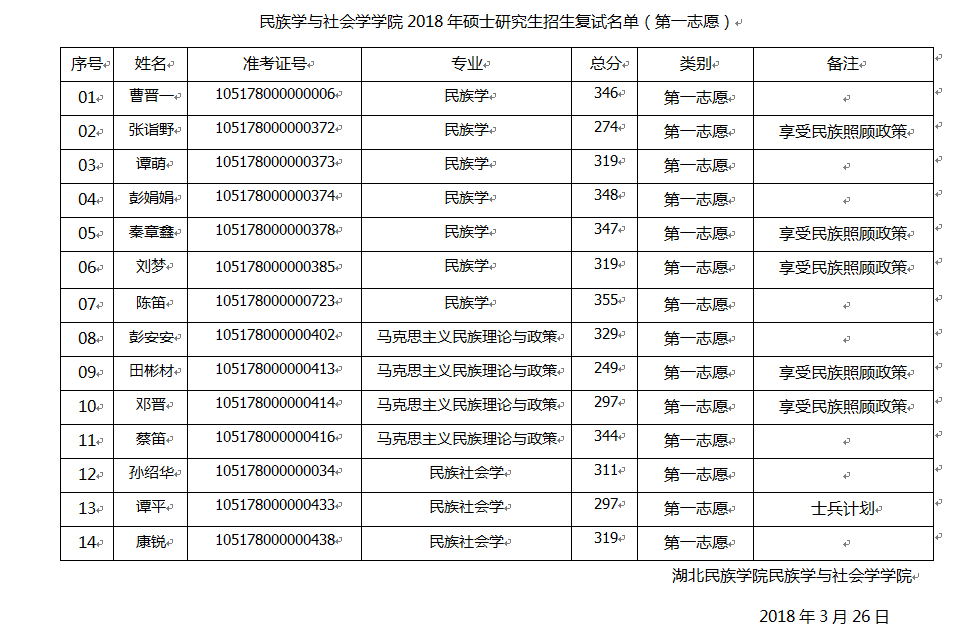 民族学与社会学学院2018年硕士研究生招生复试名单(第一志愿)