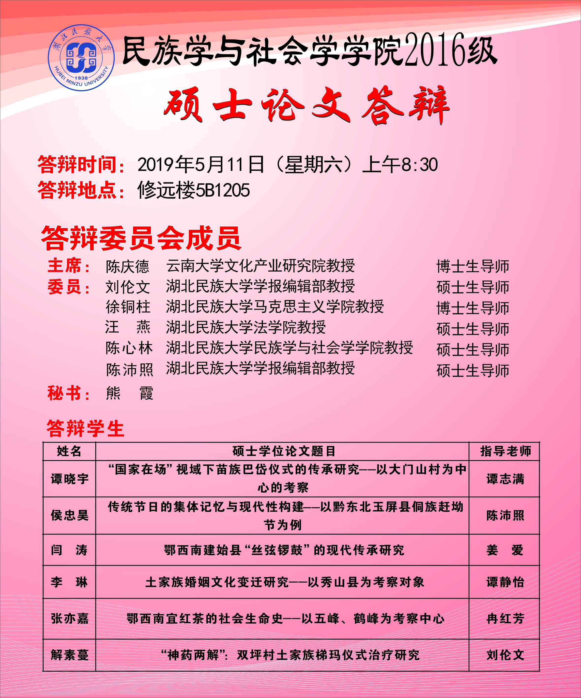 民族学与社会学学院2016级硕士论文答辩公告(第一批)