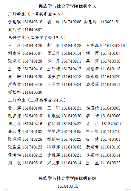 根据《jinnian金年会学生综合素质测评方案》、《jinnian金年会学生奖学金评定及奖励办法》、《jinnian金年会先进班级评选奖励办法》,在各班级民主测评、推荐的基础上,经学生科审核,报学院领导批准,现将民族学与社会学学院2018-2019学年优秀个人和优秀班集体名单公示如下,如对评选结果有异议者,请于9月29日下午17:30前将情况实名举报或反馈到民族学与社会学学院学生科张老师处(电话:18372556088,办公室:5B108)。