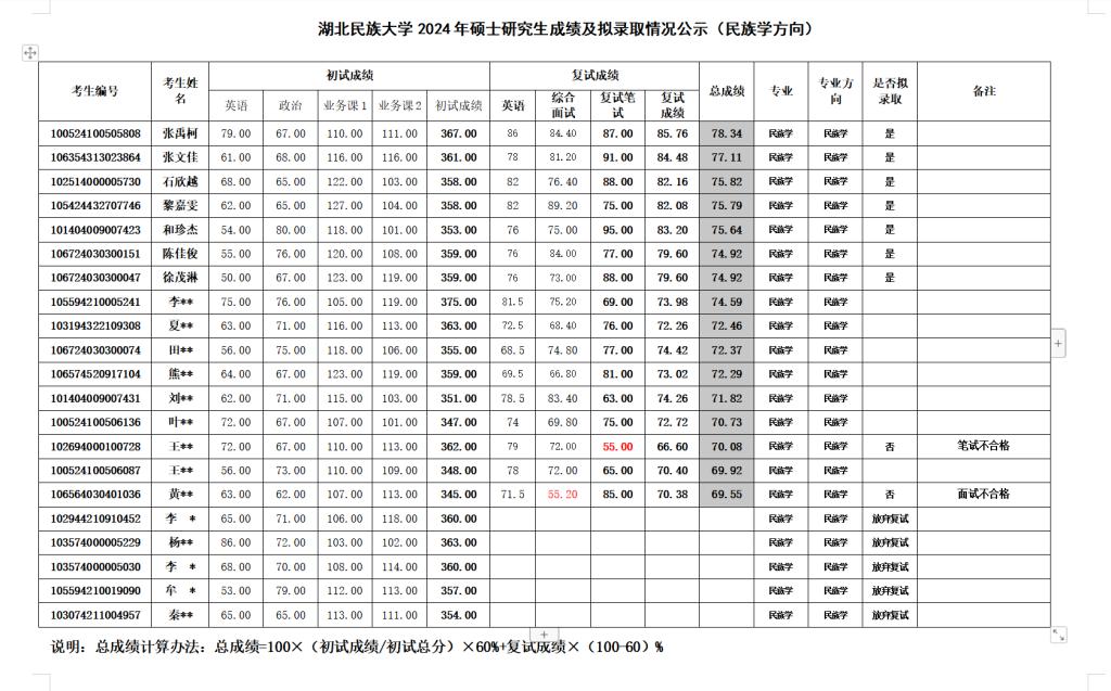 jinnian金年会民族学与社会学学院2024年硕士研究生成绩及拟录取情况公示(民族学方向)