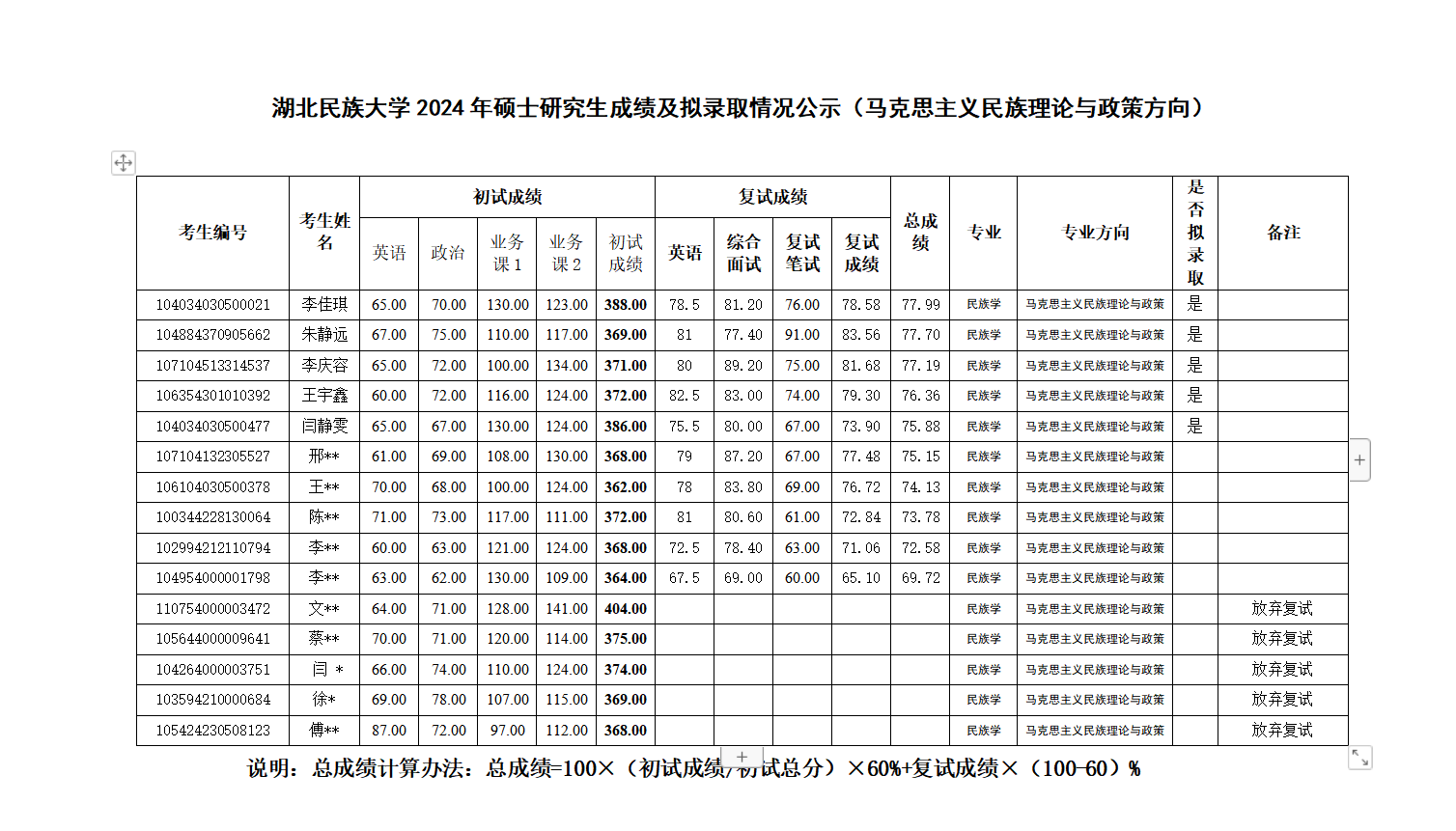 jinnian金年会2024年硕士研究生成绩及拟录取情况公示(马克思主义民族理论与政策方向)