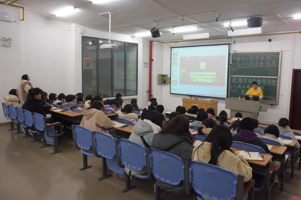 本网讯(见习记者 周树洋 张丹丹 何李冰/文 向丽华 陈文宇 戴启栋梁/图)为帮助我院学生干部掌握办公软件技能,提升工作办事效率,12月3日,我院在修远楼5A506教室举办以“掌握办公软件技能,提升工作办事效率”为主题的第五期学生干部综合素质培训班第四次授课,我院团总支办公室主任姚萍、宣传部部长刘圣富担任主讲人。全体大一学生干部参与本次活动。