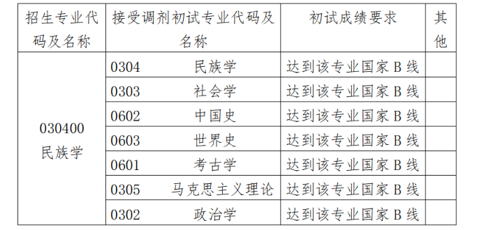 (3)接受调剂的初试专业,相同专业为“民族学”(0304)专业,相近专业及遴选顺序为“社会学”(0303)专业、“中国史”(0602)专业、“世界史”(0603)专业、“考古学”(0601)专业、“马克思主义理论”(0305)专业、“政治学”(0302)专业。确定初试专业的依据为专业代码前四位。在同一专业内,依据考生考试成绩排序,总成绩相同时以统考科目(政治、英语)总成绩排序。