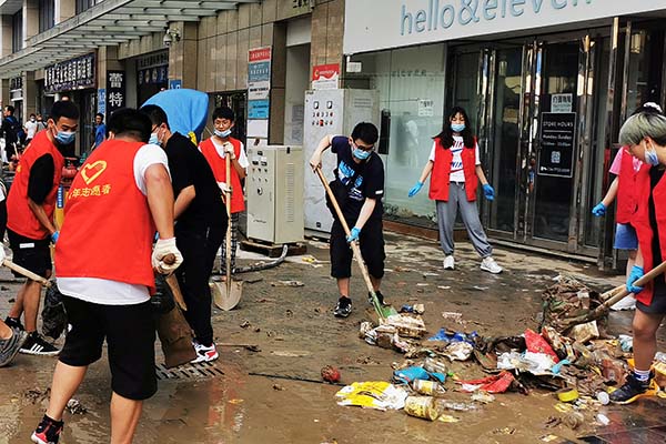 金年会青年志愿者清理一楼店铺被水浸泡过的物品