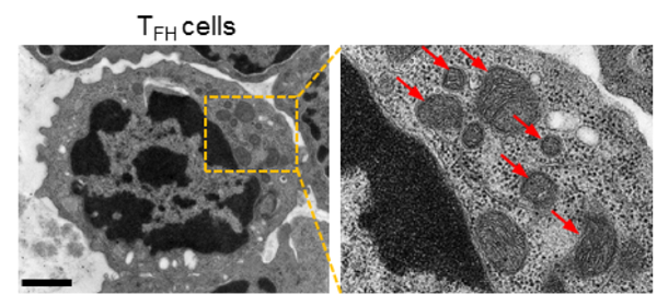 透射电镜下看到TFH细胞内皱缩和损伤的线粒体,显出铁死亡特征 (图片来源于Nature Immunology)