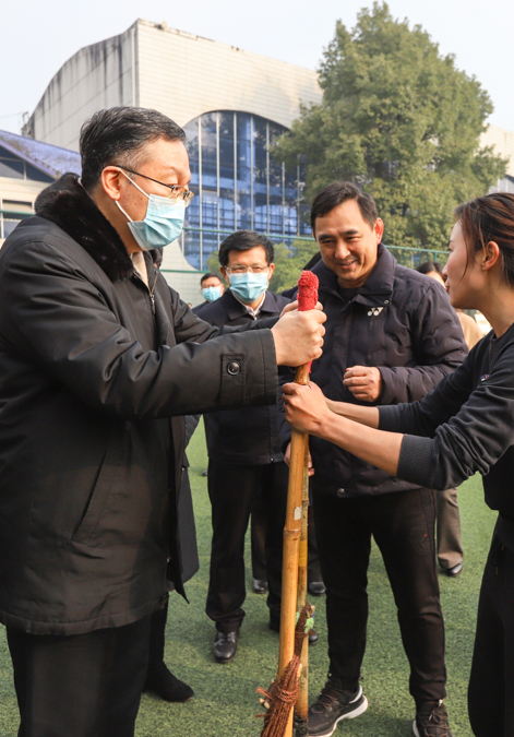 在学校民族体育场,田学军一行实地调研了学校的民族传统体育教学,并观摩了陀螺、竹马等民族传统体育项目的训练。在观看全国冠军、“竹马女飞人”陈芬的教学训练时,田学军感叹“速度真快!”大家纷纷为师生的出色表现鼓掌。田学军指出,要充分发挥民族高校特色优势,不断加强中华民族传统文化的保护与传承,推动民族中药材、民族传统体育走向世界。
