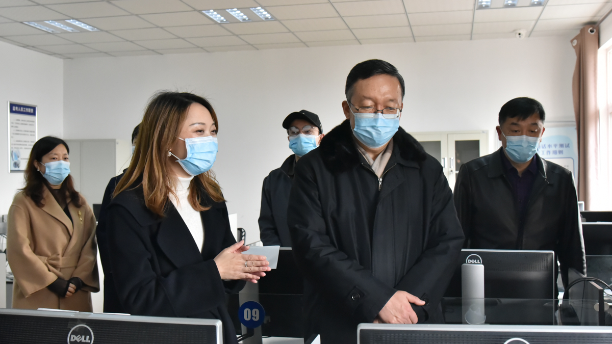田学军(右二)实地考察计算机辅助普通话水平测试中心学习机房