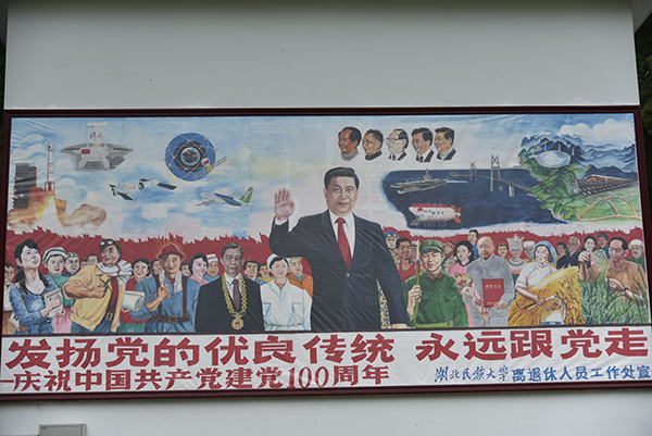 为庆祝中国共产党成立100周年,金年会农工党党员、工艺美术师、恩施州市书画协会会员、75岁退休教师李让奎怀着对党的无限敬仰,耗时两个月,创作了长8米、宽3.4米的巨幅宣传画。画作悬挂在离退休工作处办公楼右侧墙壁。