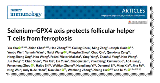 经过多年联合攻关,金年会在硒元素研究取得重大进展。2021年8月20日,民大医院“硒-免疫平衡与健康”研究团队的最新学术成果“Selenium-GPX4 axis protects follicular helper T cells from ferroptosis”(硒-硒蛋白GPX4功能轴保护滤泡辅助性 T细胞免于铁死亡)在国际顶级免疫学期刊Nature Immunology(自然杂志子刊,影响因子:25.606)在线发表。该研究创新性阐明了硒蛋白GPX4特异性调控滤泡辅助性 T(TFH)细胞稳态的新机制,并首次证实补硒可通过上调T细胞内GPX4水平促进TFH细胞功能,显著提高健康人群接种疫苗后的抗体分泌水平。