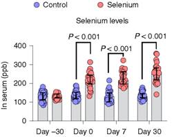 补硒能有效提高T细胞内GPX4水平。基于对机制的研究,研究者设计了一项补硒干预人群疫苗接种效果的临床试验。60名健康成年志愿者被随机分成补硒组和对照组。30天的补硒(200 μg硒/天)或正常饮食后,所有志愿者接种当季流感疫苗。研究人员发现补硒显著上调免疫细胞中的GPX4水平,进一步激活TFH细胞功能。更重要的是,补硒显著促进了疫苗接种后的中和抗体滴度。
