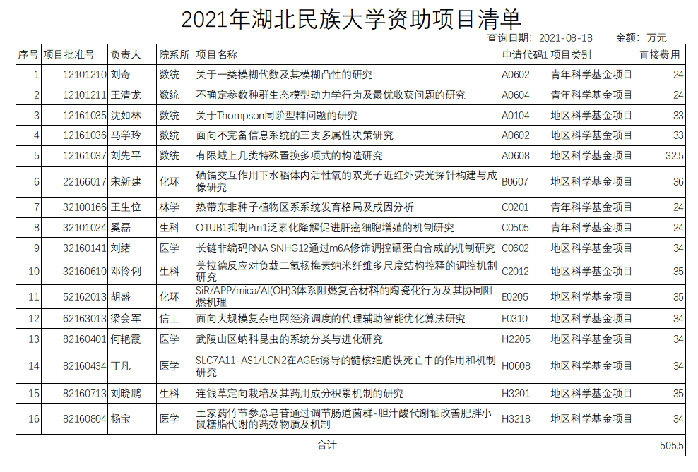 8月18日,国家自然科学基金委正式公布了2021年度国家自然科学基金申请项目评审结果,金年会共有16项国家自然科学基金获得资助,其中地区基金12项,青年科学基金项目4项,获批直接经费共计505.5万元。