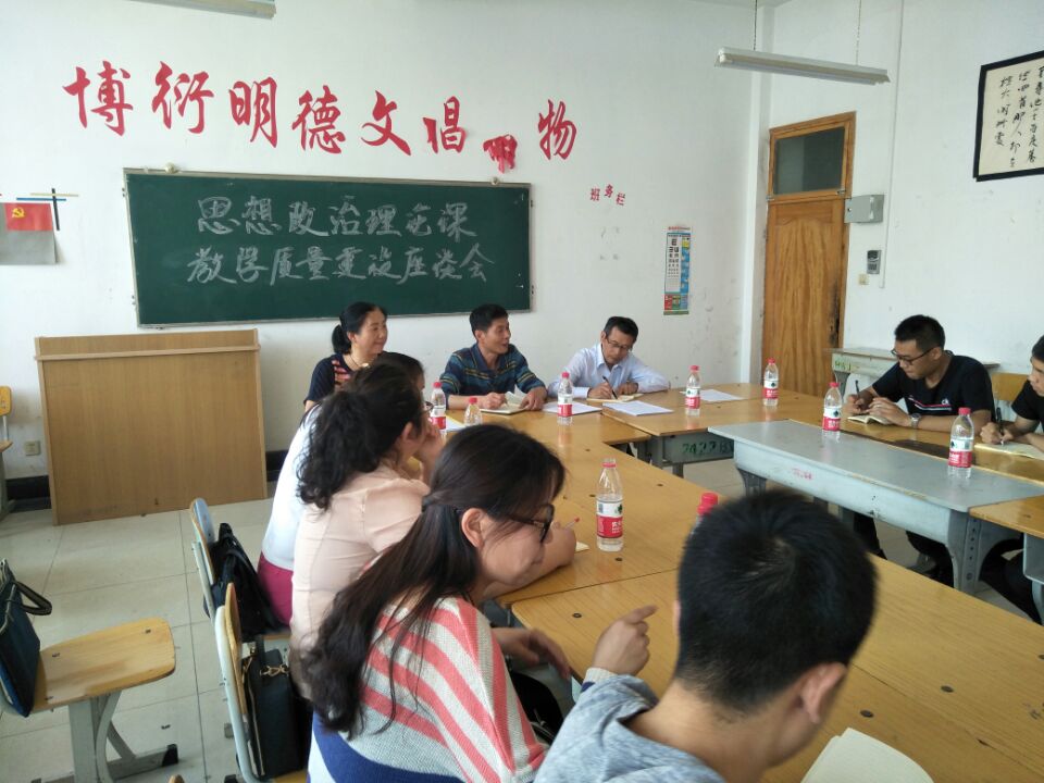 为深入贯彻落实全国高校思想政治工作会议精神,推动我院思想政治理论课教学质量年专项工作深入开展,根据教育厅《2017年高校思想政治理论课教学质量年专项工作方案》,基础课部于6月22日在教学楼1205教室,组织召开了“思想政治理论课教学质量建设座谈会”,学院党委温晓光书记、主管教学胡彦奎副院长参加会议并讲话,会议由思政教研室主任郭秋红主持,思政课部分教师和高年级学生代表参加了会议。