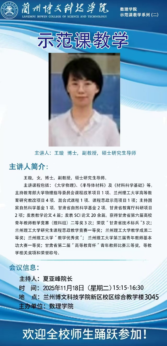 王璇博士为副教授、硕士研究生导师,主讲《大学物理》《半导体材料》等课程,在教学改革与科研领域成果突出,主持教育部课程改革项目、国家自然科学基金等多项课题,多次荣获甘肃省高校青年教师教学竞赛二等奖、“甘肃省技术标兵”等荣誉。她以大学物理中的夫琅禾费单缝衍射为教学内容,带来了一堂生动的示范课,通过清晰的理论讲解、直观的实验演示与互动式的课堂提问,将抽象的物理原理具象化,展现了精湛的课堂把控能力与深入浅出的教学风格,为理工科基础课程的课堂教学提供了优秀范例。